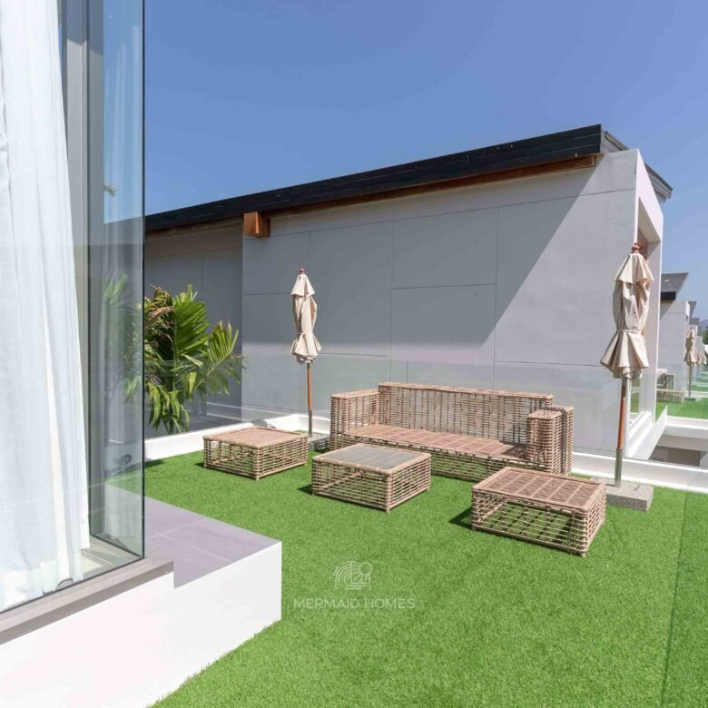 The villa’s layout encompasses 338 square meters of interior living space. It includes three generously sized bedrooms and four bathrooms, offering comfort and privacy for families and guests. The main living area connects directly to an outdoor terrace featuring a private saltwater swimming pool—a premium feature offering a gentler swimming experience with lower chemical maintenance.